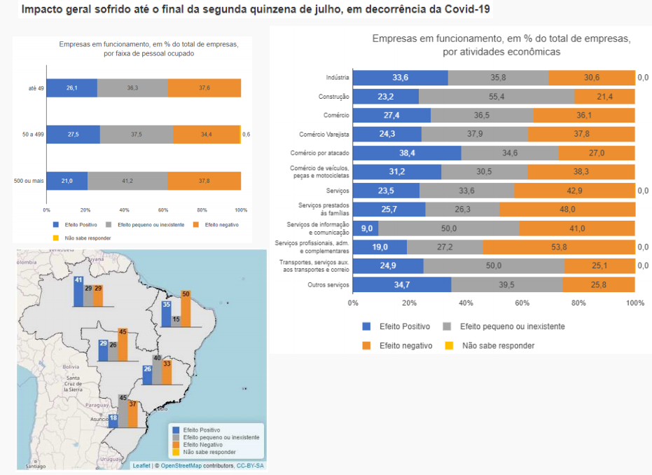 Estratificado em regiões, os efeitos foram negativos para 49,6% das empresas do nordeste; 44,7% das empresas do centro-oeste; 36,7% das empresas do sul; 33,3% das do sudeste; e 29,4% das do norte.