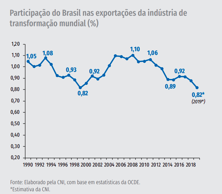 Entre 1994 a 1995, a participação da indústria nacional no mundo estava em 2,7% e veio caindo ano a ano, chegando a 1,19% em 2019. Os números foram divulgados hoje pela Confederação Nacional da Indústria (CNI).