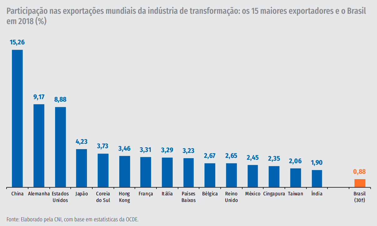 Hoje a indústria brasileira tem apenas 0,88% de participação no mundo, números muito inferiores aos da Bélgica (2,67%) e México (2,45%).