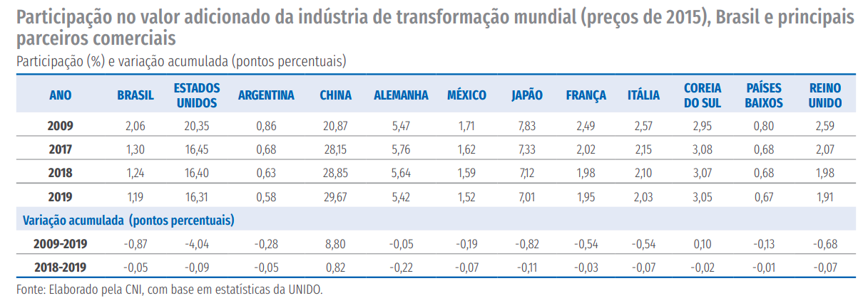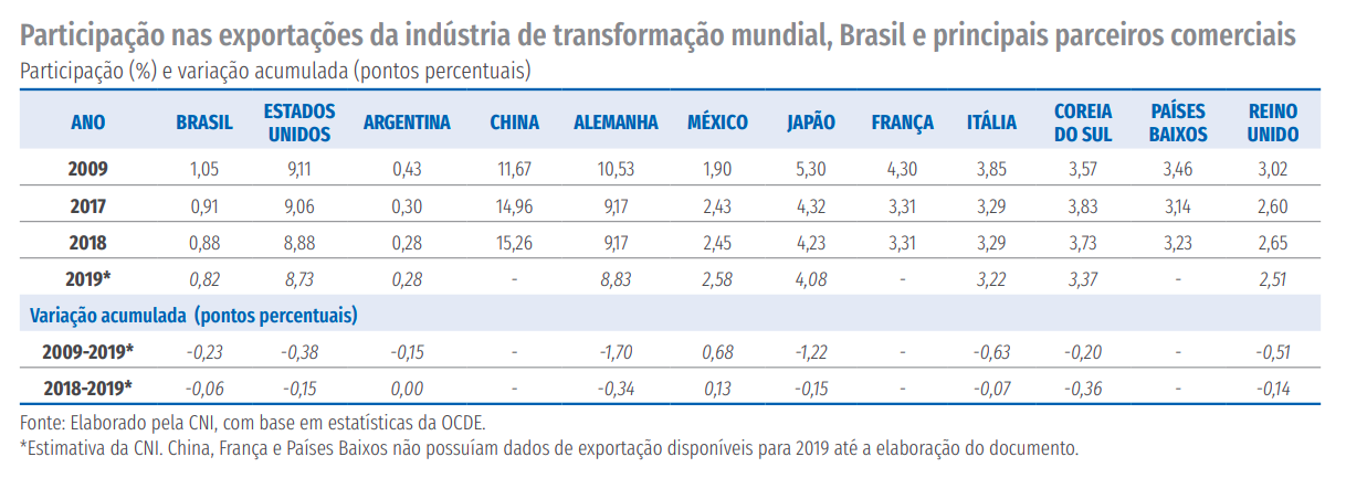 Outros países também perderam participação. A Argentina, por exemplo, reduziu sua participação de 0,86% em 2009 para 0,58% em 2019.