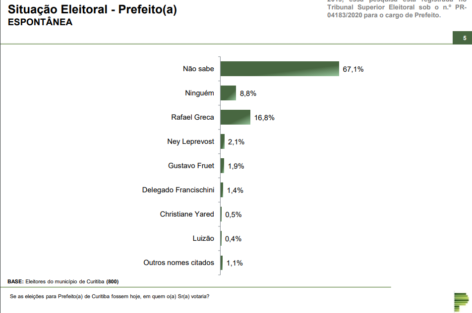 Os nomes testados na pesquisa estimulada foram: Rafael Greca (DEM), Ney Leprevost (PSD), Gustavo Fruet (PDT), Delegado Francischini (SDD), Christiane Yared (PL), Luizão (PRB), Cida Borghetti (Progressistas), Dr. João Guilherme (Novo), Caroline Arns (Podemos), Professor Renato Mocellin (PV), Paulo Opuszka (PT), Zé Boni (PRTB), Letícia Lanz (PSOL), Professor Eloy Casagrande (Rede).