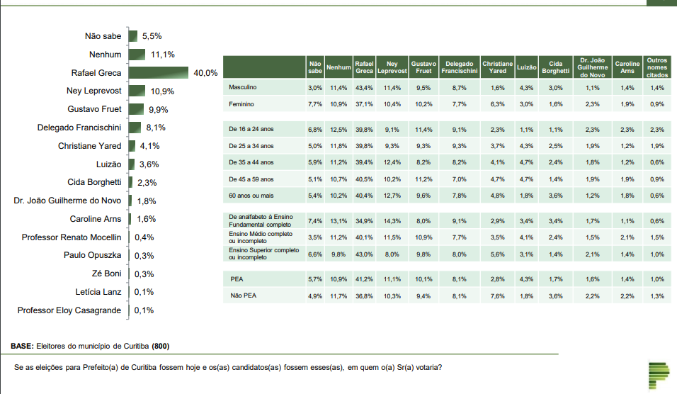 Já na estimulada a porcentagem de pessoas que escolhem o nome de Greca é de 40%, seguido por 10,9% de Leprevost e 9,9% de Fruet.