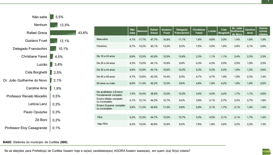 No segundo cenário testado, a situação é ainda mais favorável para Greca: ele tem 43,6% das intenções de votos.