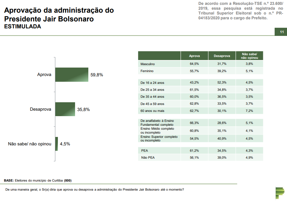 A pesquisa também mediu a aprovação do presidente Jair Bolsonaro na capital paranaense.