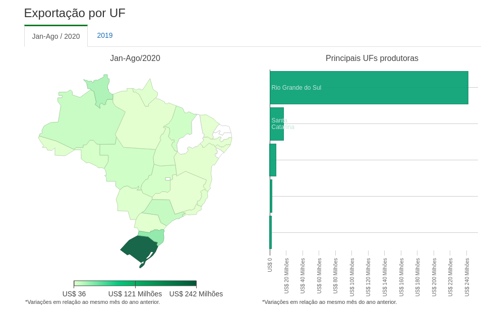 Enquanto as exportações de arroz semi-elaborado cresceram 38% em jan/ago, a alta das vendas de arroz bruto foi de quase 170%. Em jan/ago, o Brasil exportou 487 mil toneladas de arroz bruto, e 666 mil toneladas de arroz semi-elaborado.