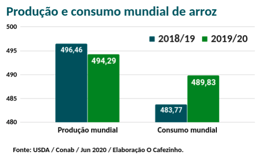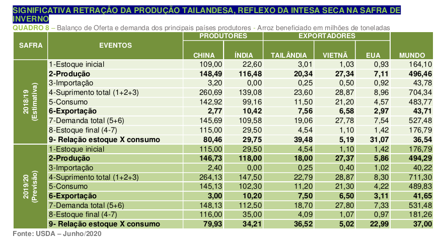 A produção de arroz nos EUA também caiu significativamente, de 7 milhões de toneladas em 2019 para 5,8 milhões este ano.
