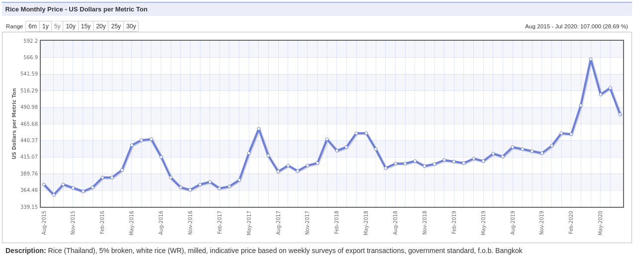 O gráfico dos últimos 5 anos mostra que a cotação do arroz atingiu o maior patamar desse período, atingindo o pico de 564 dólares por tonelada em abril desse ano. A explicação para essa alta, segundo uma análise divulgada no site da Conab (órgão federal responsável pela política agrícola), seria a “retração da produção tailandesa, reflexo da intensa seca na safra de inverno”.