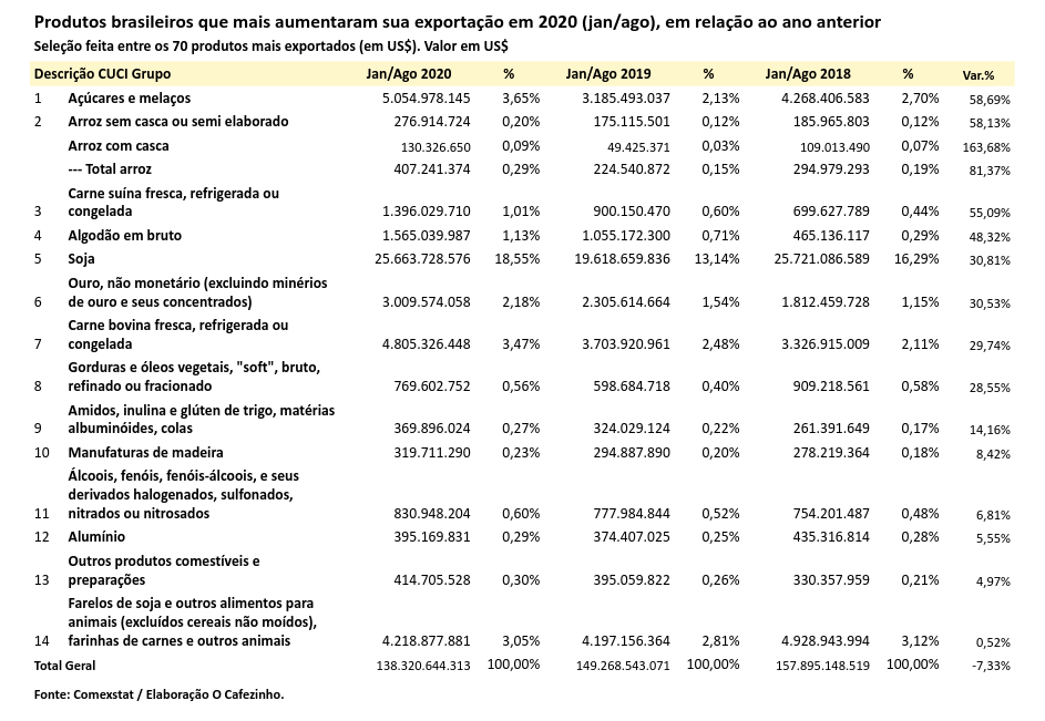 O arroz foi também o produto com registrou o maior aumento de suas exportações este ano, na comparação com o ano anterior, e considerando os 70 principais produtos exportados pelo Brasil.