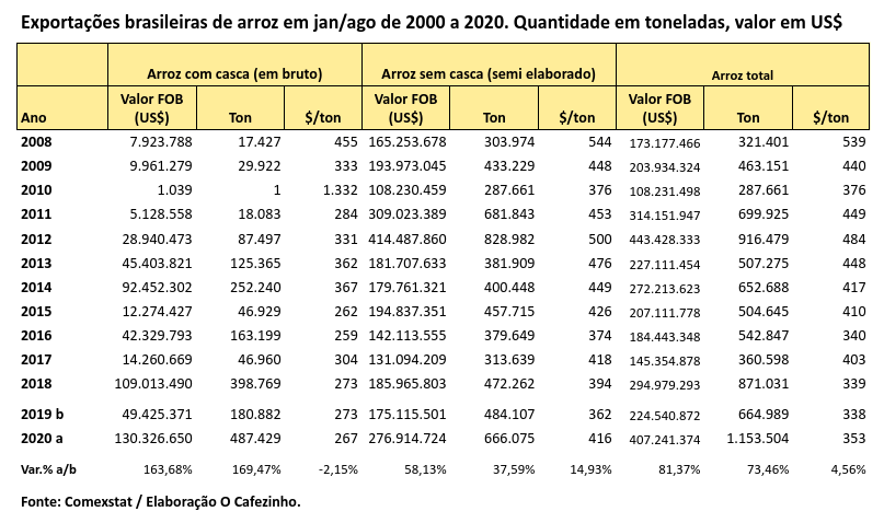 E foi exatamente isso o que aconteceu. As exportações brasileiras de arroz ultrapassaram todos os seus recordes históricos, e atingiram mais de 1 milhão de toneladas no acumulado dos oito meses deste ano (jan/ago), alta de 73% sobre igual período do ano passado.
