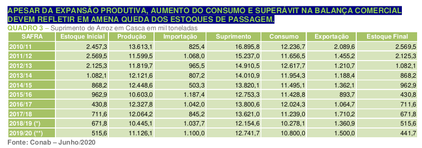 Ainda segundo a Conab, os estoques finais de arroz no Brasil, ao final do ano-safra 2019/20, serão os menores da série histórica: 441,7 mil toneladas. Para efeito de comparação, ao final do ano-safra 2010/11, esses estoques estavam em 2,56 milhões de toneladas.