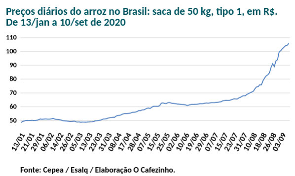 Queda nos estoques, e aumento do consumo mundial, alta da cotação internacional, todos esses fatores contribuíram para a alta no preço da saca de 50 kg de arroz, que passou de menos de R$ 50 em janeiro, para quase R$ 110 na segunda semana de setembro.