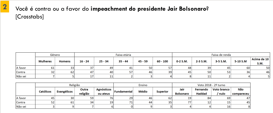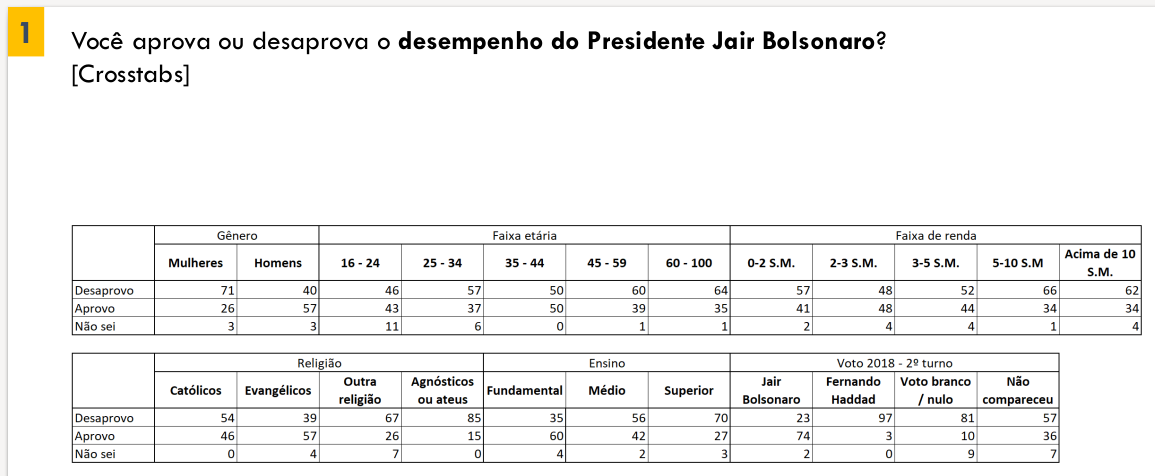 A rejeição a Bolsonaro é maior entre mais escolarizados e com maior renda: entre eleitores com ensino superior, 70% rejeitam Bolsonaro. Entre eleitores com renda familiar acima de 5 salários, 66% reprovam seu governo.