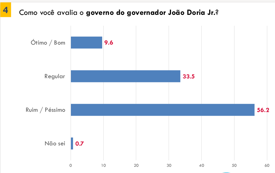 A avaliação do governo Bruno Covas, segundo a mesma pesquisa, não é boa: apenas 17% responderam que o consideram bom ou ótimo, contra 45% que preferiam qualificá-lo de ruim ou péssimo. Esses números mostram uma liderança política com grandes dificuldades de se reeleger.