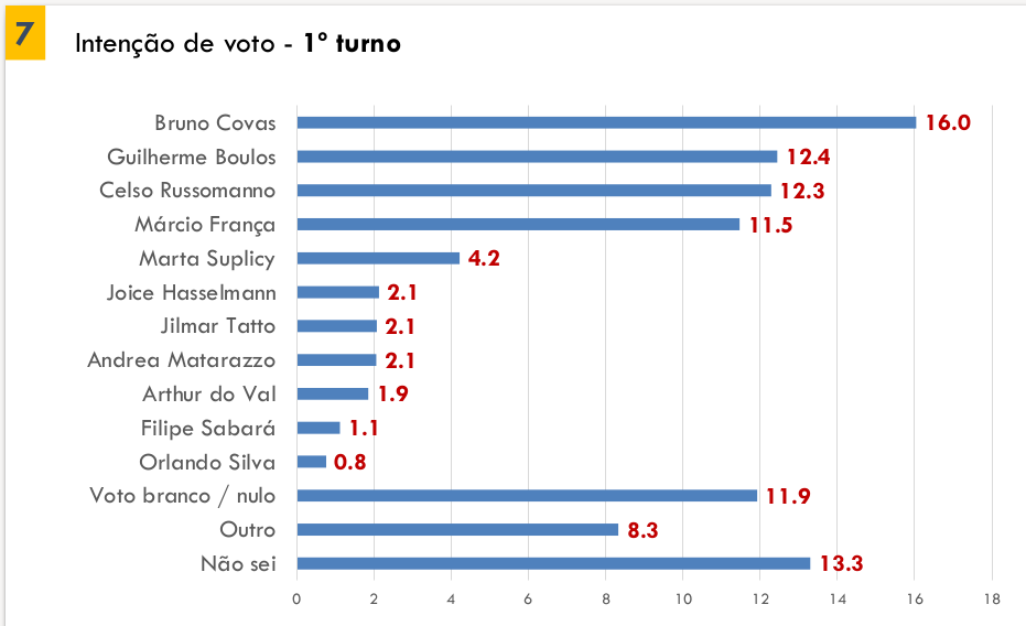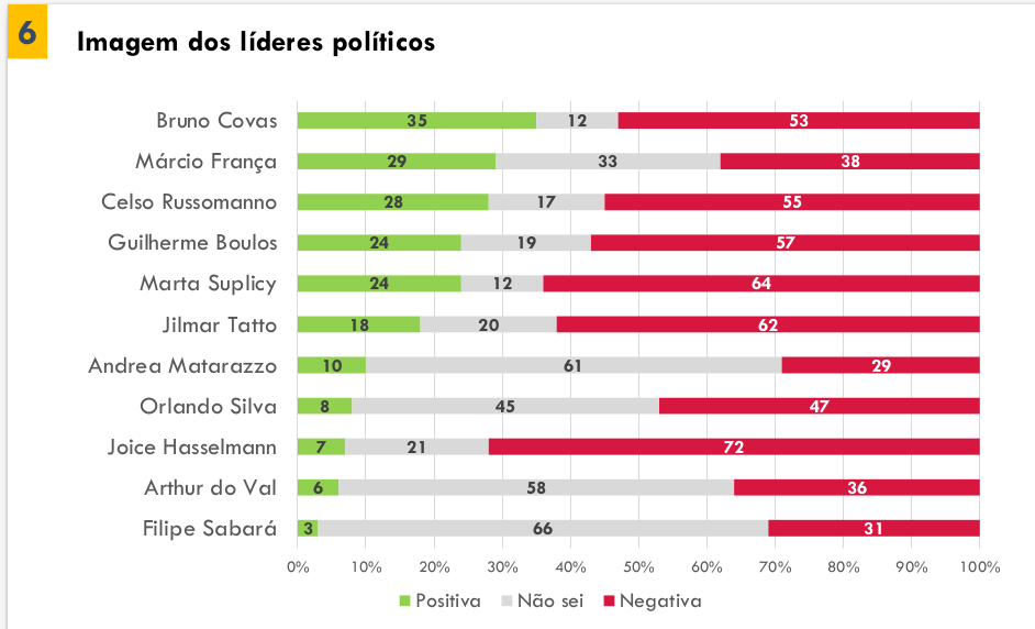 A pesquisa apura ainda a imagem dos principais candidatos. Entre aqueles com rejeição acima de 60%, temos Martha Suplicy, Jilmar Tatto e Joice Hasselman. As melhores pontuações positivas ficaram com Covas (35%), França (29%), Russomano (28%) e Boulos (24%).