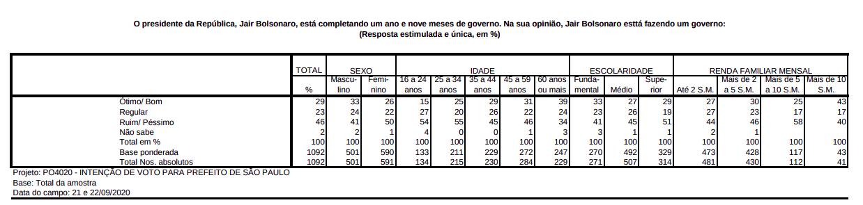 Bolsonaro é rejeitado sobretudo entre mais jovens, até 34 anos, entre os quais tem aproximadamente 54% ou 55% de rejeição; e eleitores com ensino superior, entre os quais tem 51% de rejeição. Outros segmentos que apresentam bastante rejeição ao presidente são eleitores com renda entre 5 e 10 salários, entre os quais ele tem 58% de rejeição, e moradores da região central da cidade, onde Bolsonaro tem 53% de ruim/péssimo (contra 38% de rejeição na zona norte).
