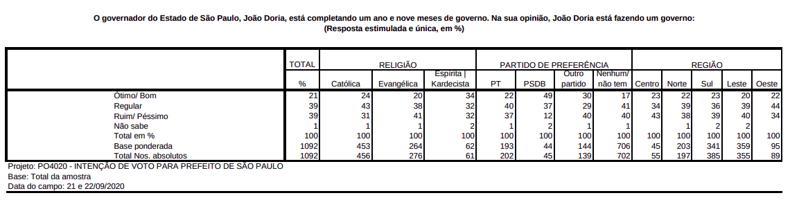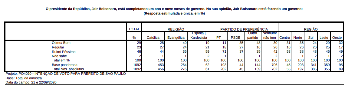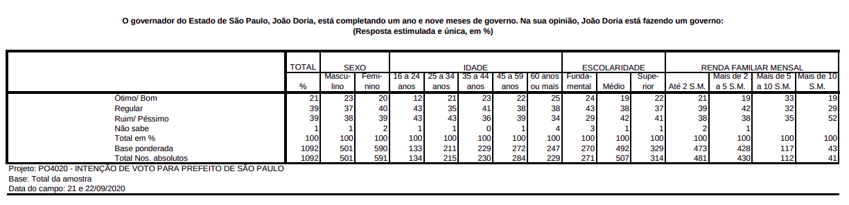 Bolsonaro é o personagem mais polarizado. Ele tem um maior índice de ótimo/bom, 29%, do que o governador, que tem apenas 21%. Mas o presidente também é bem mais rejeitado, com 46% de ruim/péssimo, do que Doria, que tem 39% neste quesito.
