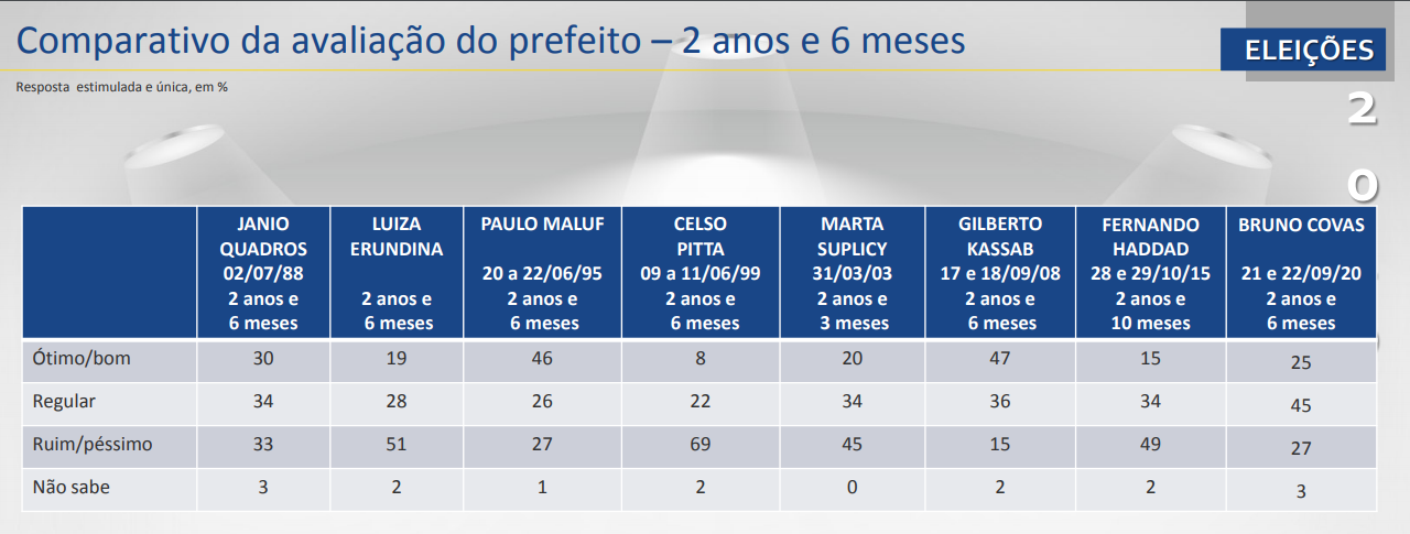 Outra mudança relevante é que, à diferença de 2016, quando o então prefeito Fernando Haddad sofria com uma péssima avaliação dos eleitores, o atual ocupante do cargo, Bruno Covas, tem um desempenho razoável. Os 25% de bom e ótimo não é nada de sensacional, sobretudo se compararmos com os graus de satisfação de alguns outros prefeitos, como Kalil em Belo Horizonte e ACM Neto em Salvador; a vantagem de Covas é sobretudo o percentual relativamente baixo de ruim e péssimo, apenas 27%. Haddad, no mesmo período, tinha 49% de ruim e péssimo; Marta Suplicy e Erundina, 49% e 51%, respectivamente, no mesmo período de suas administrações.