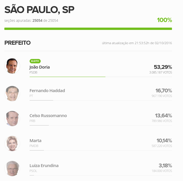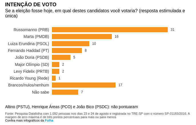 Em 2016, por exemplo, a 39 dias das eleições, o então candidato Russomano aparecia em liderança isolada, com 31% das intenções de voto. Quando as urnas se abriram, porém, o apresentador de TV, conhecido em quase todos os lares paulistanos, teve apenas 13,6% dos votos válidos, num terceiro distante lugar, enquanto João Dória, que estava em quinto lugar na pesquisa Datafolha do dia 24 de agosto, com 5% dos votos, ganhava no primeiro turno, com 53% dos votos.