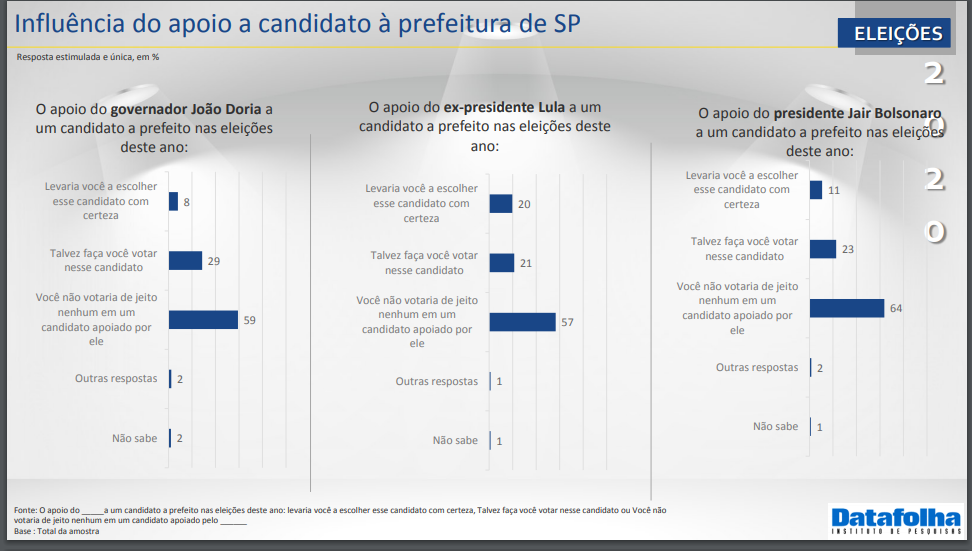 A mesma pesquisa Datafolha estima que 20% dos paulistanos votariam “com certeza” num candidato apoiado pelo ex-presidente Lula. Esse percentual garantiria sua ida ao segundo turno. O problema é que o PT tem um candidato, Jilmar Tatto, que terá o monopólio da imagem de Lula em sua propaganda eleitoral.