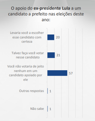 Por outro lado, o presidente Bolsonaro não apresenta boa imagem junto ao eleitor paulistano: uma maioria impressionante de 64% afirma que o apoio de Bolsonaro teria o efeito de não votar naquele candidato, ao passo que apenas 11% disseram que o apoio de Bolsonaro seria determinante em seu voto.