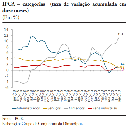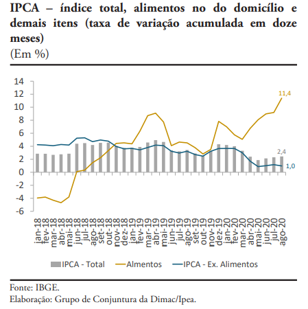 O penúltimo trimestre do ano também registrou aceleração da inflação, devido à alta nos preços dos alimentos. No acumulado de 12 meses encerrados em agosto, os produtos alimentícios responderam por 70% de toda a variação do IPCA. Isso fez com que a previsão de inflação geral para 2020 fosse revisada de 1,8% para 2,3%. As projeções, porém, foram revisadas para baixo em serviços educacionais (5% para 1,2%), demais serviços livres (2% para 0,7%) e preços monitorados (1,2% para 1%). Para 2021, a taxa de inflação estimada pelo Ipea é de 3,3%.
