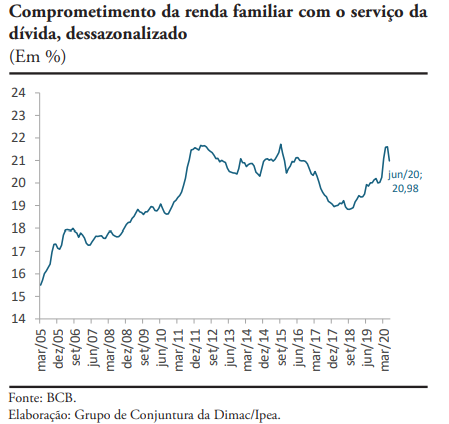 Por outro lado, o comprometimento da renda familiar com dívidas vem aumentando de maneira dramática desde o início do governo Bolsonaro, embora se note uma pequena melhora, ainda insignificante, nos últimos meses (provavelmente em função do próprio Auxílio Emergencial).