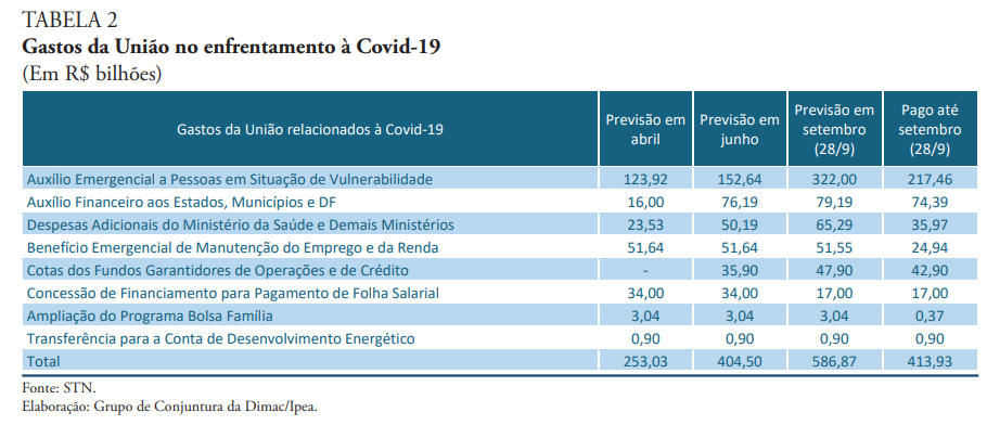 Essa outra tabela mostra o volume de dinheiro envolvido no enfrentamento a Covid-19, e explica porque evitamos um colapso social no país. O governo já gastou R$ 413,93 bilhões desde abril, número que deve crescer para R$ 586,87 bilhões no total. Apenas em Auxílio Emergencial, serão pagos R$ 322 bilhões.