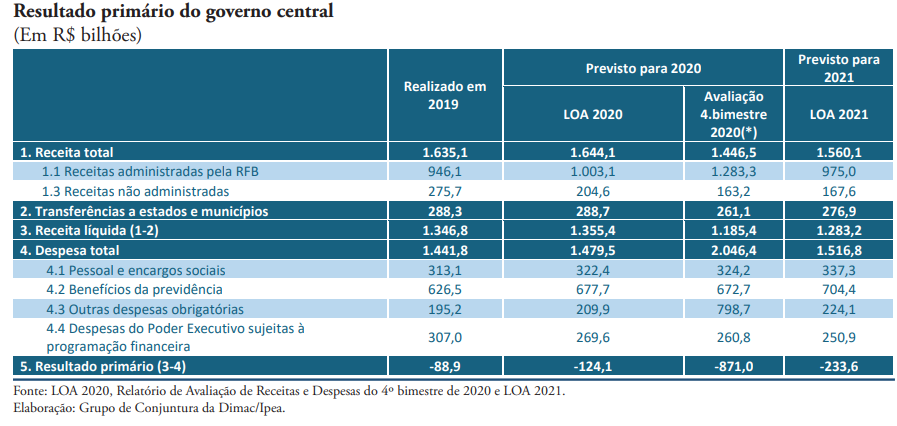 O resultado primário do governo central deve ser muito ruim este ano, por causa da pandemia, atingindo um déficit de 871 bilhões de reais. Para 2021, outro resultado preocupante: déficit de R$ 233,6 bilhões. Para efeito de comparação, o ano de 2019, registrou um déficit do resultado primário do governo central de R$ 88,9 bilhões.