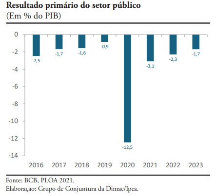 Considerando todo o setor público, o déficit do resultado primário chegará a 12,5% do PIB, o pior número da história. Para 2021, espera-se um déficit de 3,1%, o segundo maior da história.