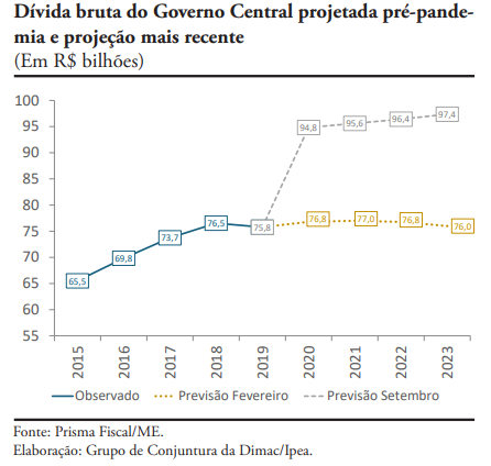 Os números da dívida bruta do governo central mostram uma deterioração da mesma até 2023, quando chegará a 97,4% do PIB.