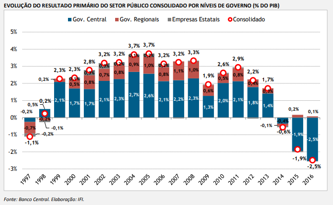 Agora vejamos o resultado primário do governo central (Tesouro Nacional, Previdência Sociais e Banco Central) e do setor público consolidado (governos federal, estaduais e municipais, mais estatais).