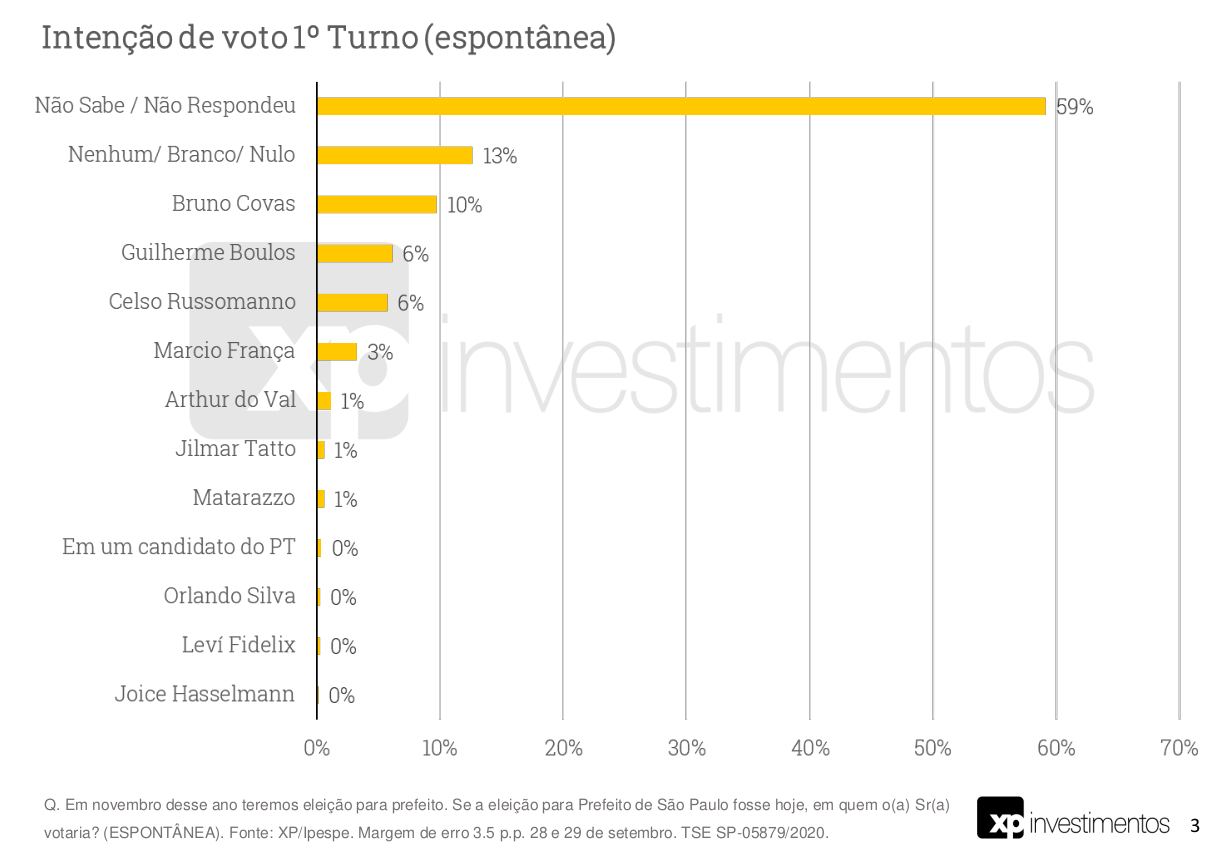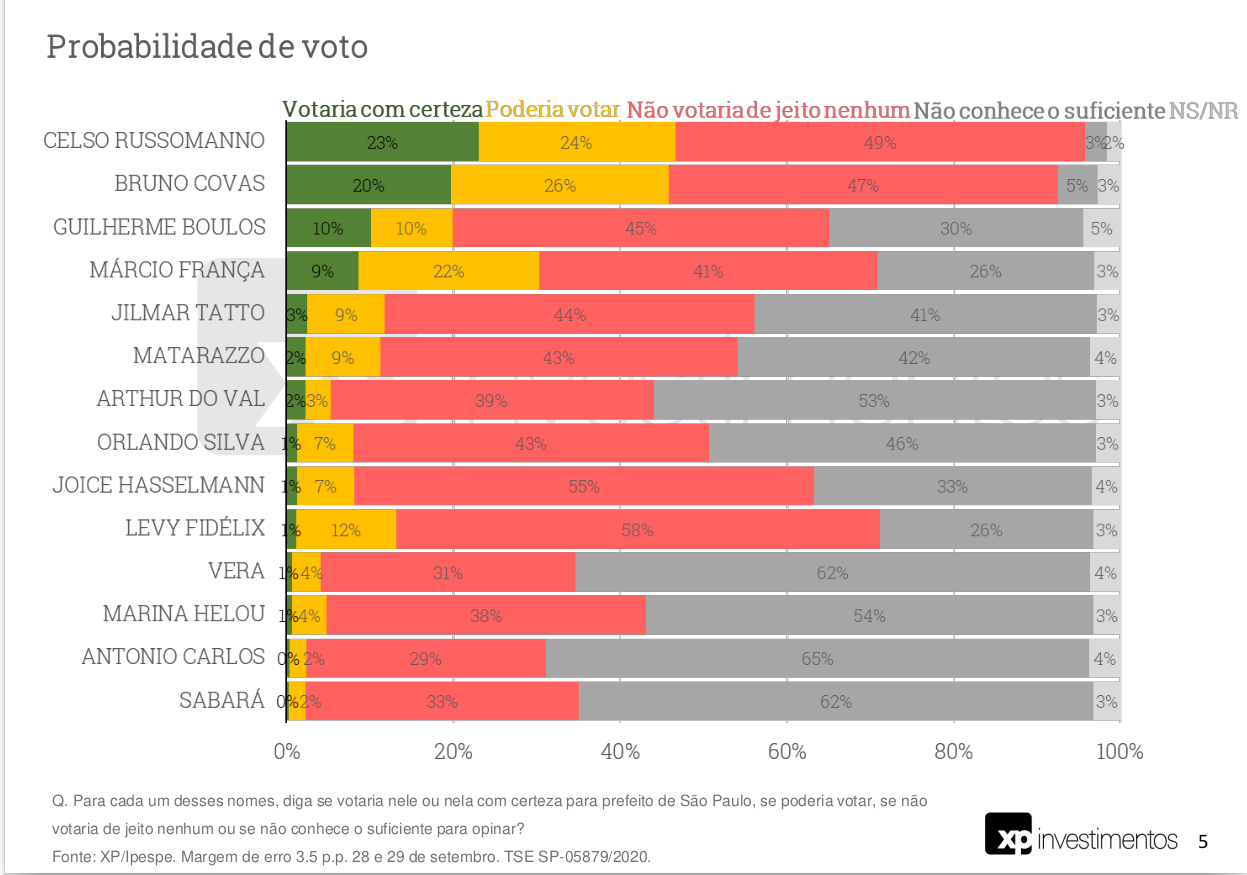 No cômputo geral, Boulos pontuou 10%, empatado com Marcio França, com 9%; ambos ainda estão muito atrás de Russomano e Covas, que tem 24% e 21%, respectivamente.