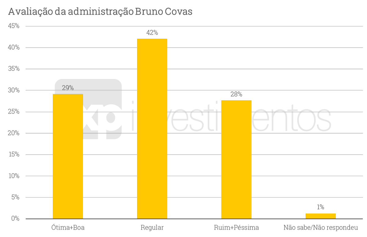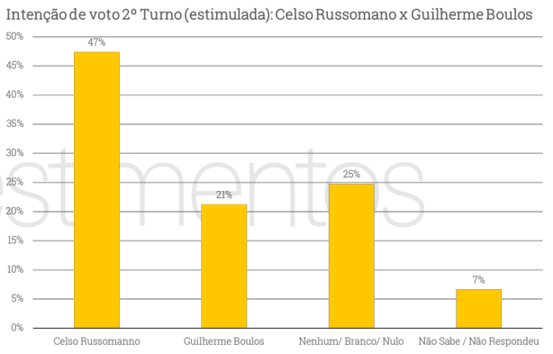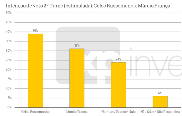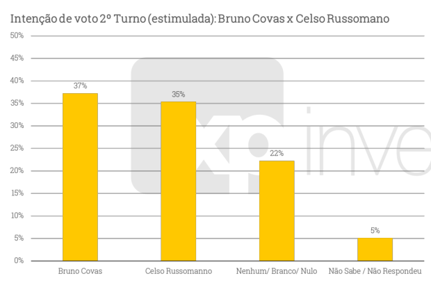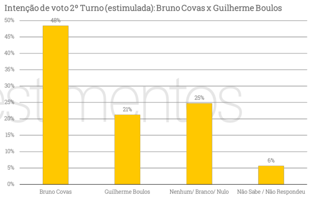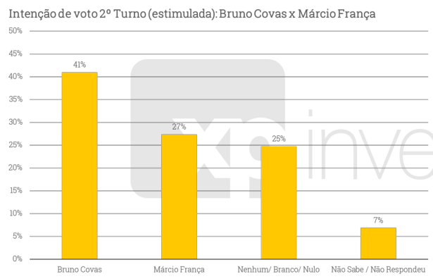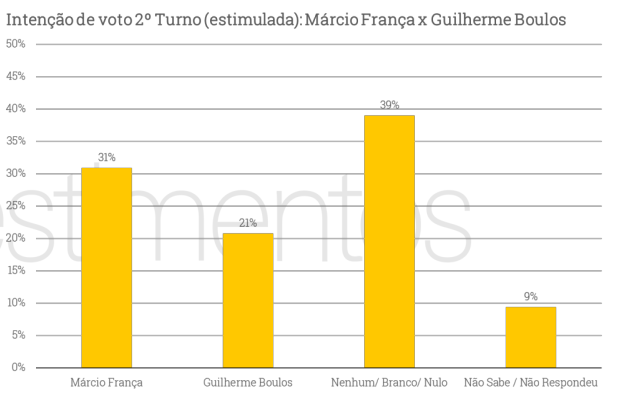 Num segundo turno Covas X Boulos, o tucano ganharia por 48% X 21% (vantagem de 27 pontos); ao passo que um segundo turno entre Covas e França teria um placar 41% X 27% (vantagem de 14 pontos).