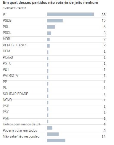De acordo com o levantamento, cerca de 36% dos eleitores declararam não votar de jeito nenhum no PT. Contudo, o partido registrou o maior número de simpatizantes, 23%.