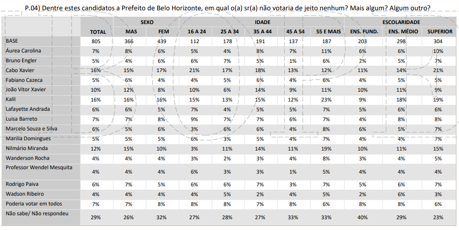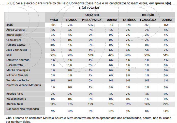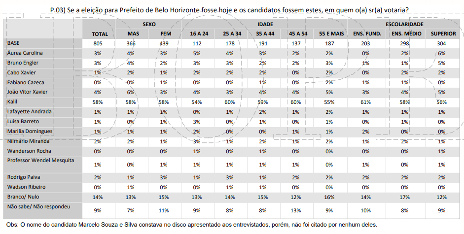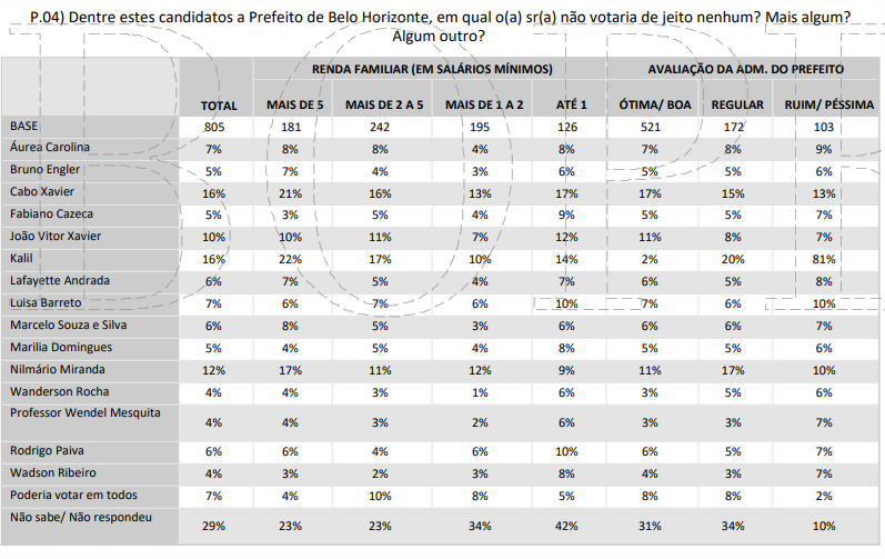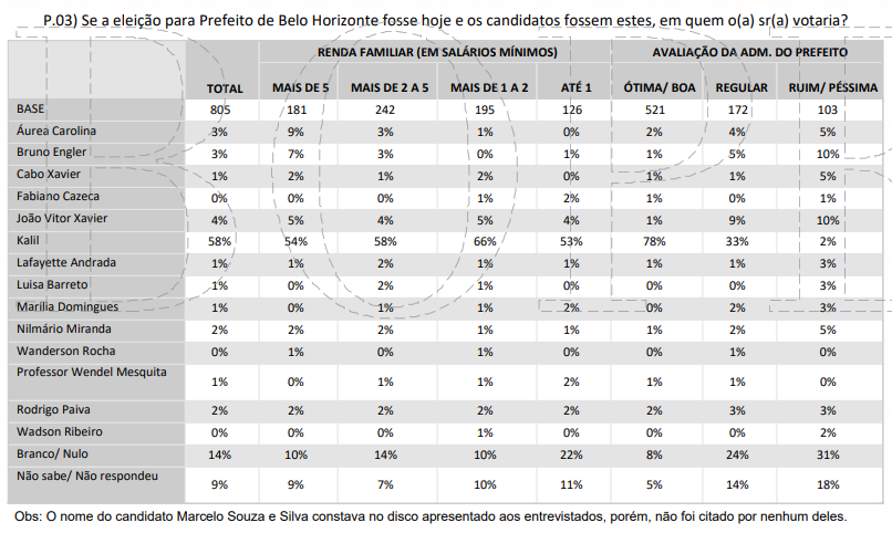 Na tabela de renda, chama a atenção a pontuação de 66% de Kalil junto a eleitores com renda entre 1 e 2 salários.