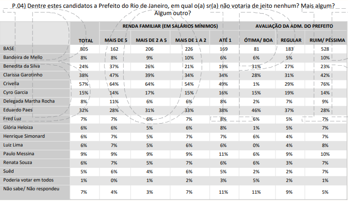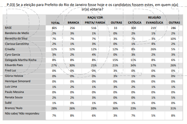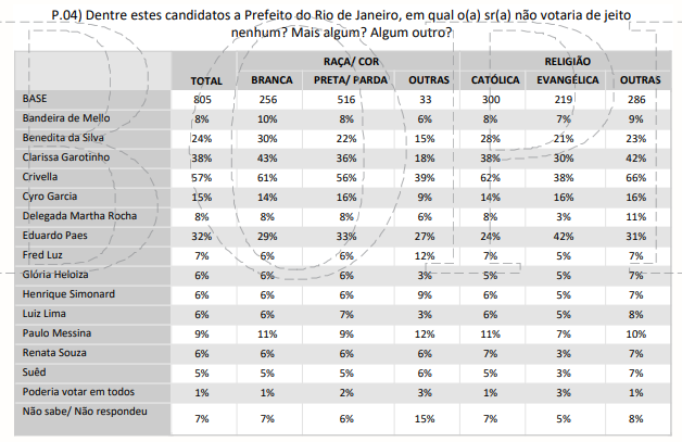 No relatório, verifica-se ainda que Marcelo Crivella já está atrás de Eduardo Paes e Martha Rocha entre eleitores não-evangélicos quando se trata das intenções de voto para as eleições deste ano.