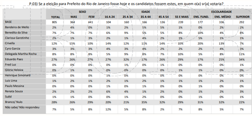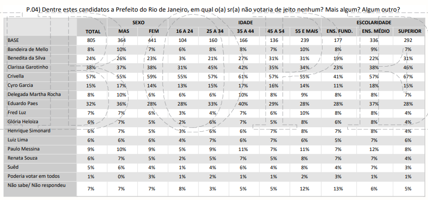 Na estratificação por sexo, idade e escolaridade, constata-se que a força de Crivella está concentrada entre eleitores de menor instrução, até o ensino fundamental, entre os quais ele tem 20% das intenções de voto.
