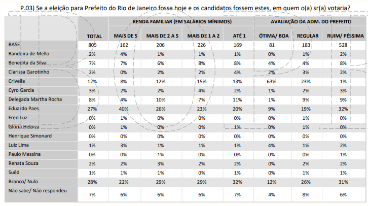 Entre eleitores com renda familiar acima de 5 salários, Crivella tem 8%, Benedita 7%, Martha Rocha 4% e Eduardo Paes, 40%.