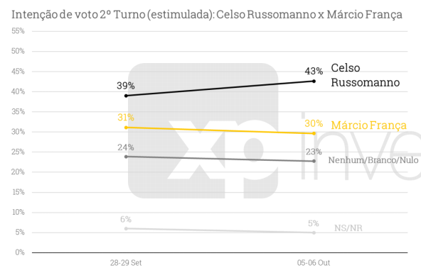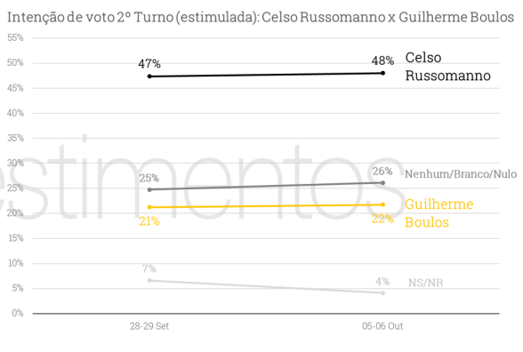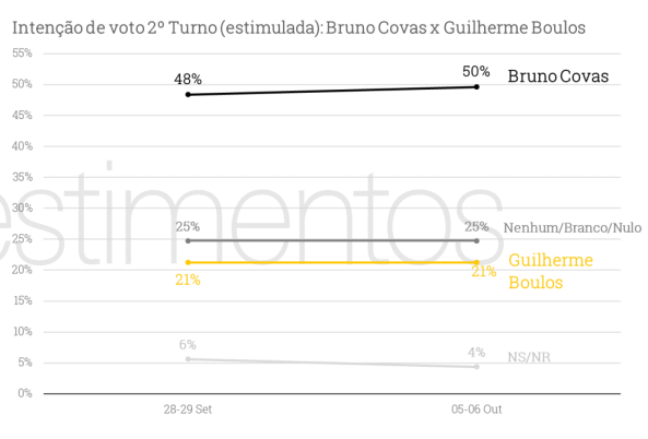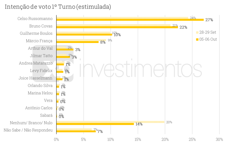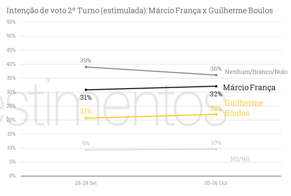 Os dois candidatos progressistas permanecem estacionados, muito longe do segundo turno, ao passo que os dois líderes demonstram resiliência: Celso Russomano, o candidato apoiado por Bolsonaro, experimentou uma alta de 3 pontos e agora tem 27% das intenções de voto; Bruno Covas, por sua vez, oscilou positivamente um ponto e agora tem 22%.