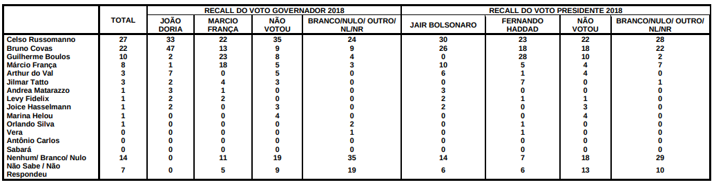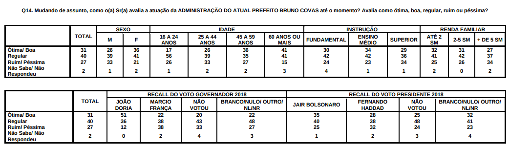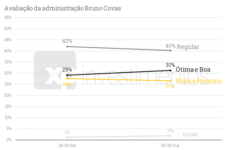 Outro fator que dificulta a vida dos candidatos de oposição é que o prefeito Bruno Covas ampliou sua aprovação: o percentual de eleitores que gostam de sua administração cresceu para 31%. A rejeição a Covas (notas péssimo/ruim) é de 27%.