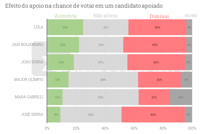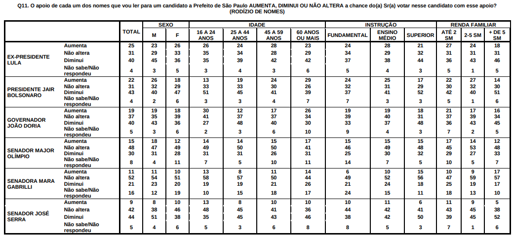 Sobre o apoio de lideranças políticas aos candidatos, elas parecem mais diminuir do que aumentar as chances do eleitor votar. Lula, Bolsonaro e Doria tem rejeição em torno de 40% do eleitorado paulistano. Lula tem a vantagem de que 25% dos eleitores responderam que seu apoio aumentar sua vontade de votar no candidato.