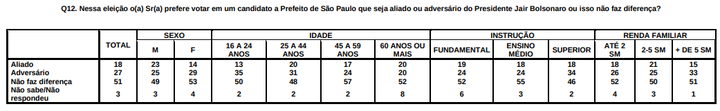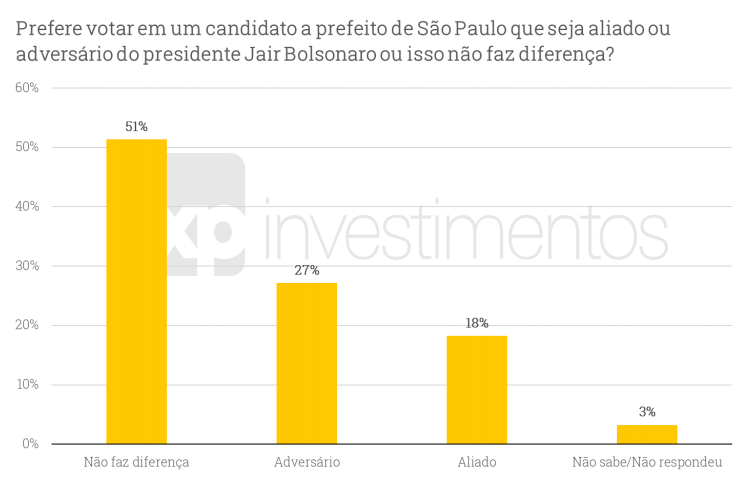 Outro gráfico, que não oferece muita perspectiva aqueles que pretendem nacionalizar a campanha em São Paulo, informa que para 51% dos paulistanos, “não faz diferença” se o candidato é aliado ou adversário de Bolsonaro. Outros 18% dizem preferir que seja aliado. Somados, temos quase 70% dos eleitores para os quais a posição política em favor de Bolsonaro é indiferente ou favorável.