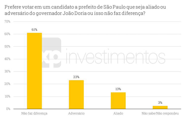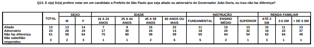 Na relação com o governador João Doria, para 74% dos eleitores o fato do candidato ser aliado não faz diferença (61%) ou é favorável (13%).