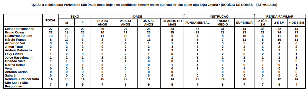 Boulos perde de Covas com diferença de 25 pontos; e também perde de Russomano, com diferença de 22 pontos.
