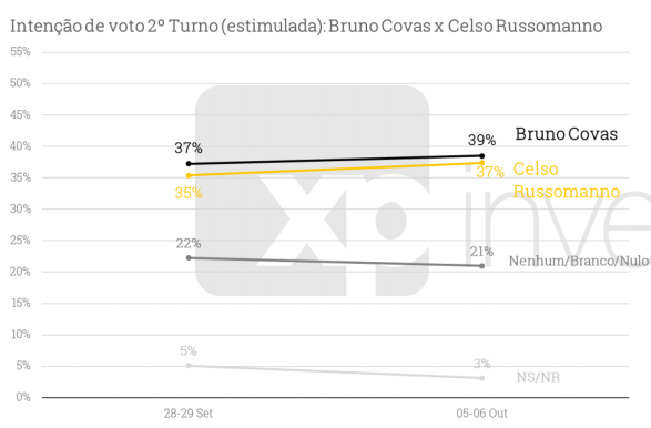O Ipespe voltou a fazer cenários de segundo turno. O cenário mais provável, entre Covas e Russomano, mostra uma disputa apertada, com os dois empatados.