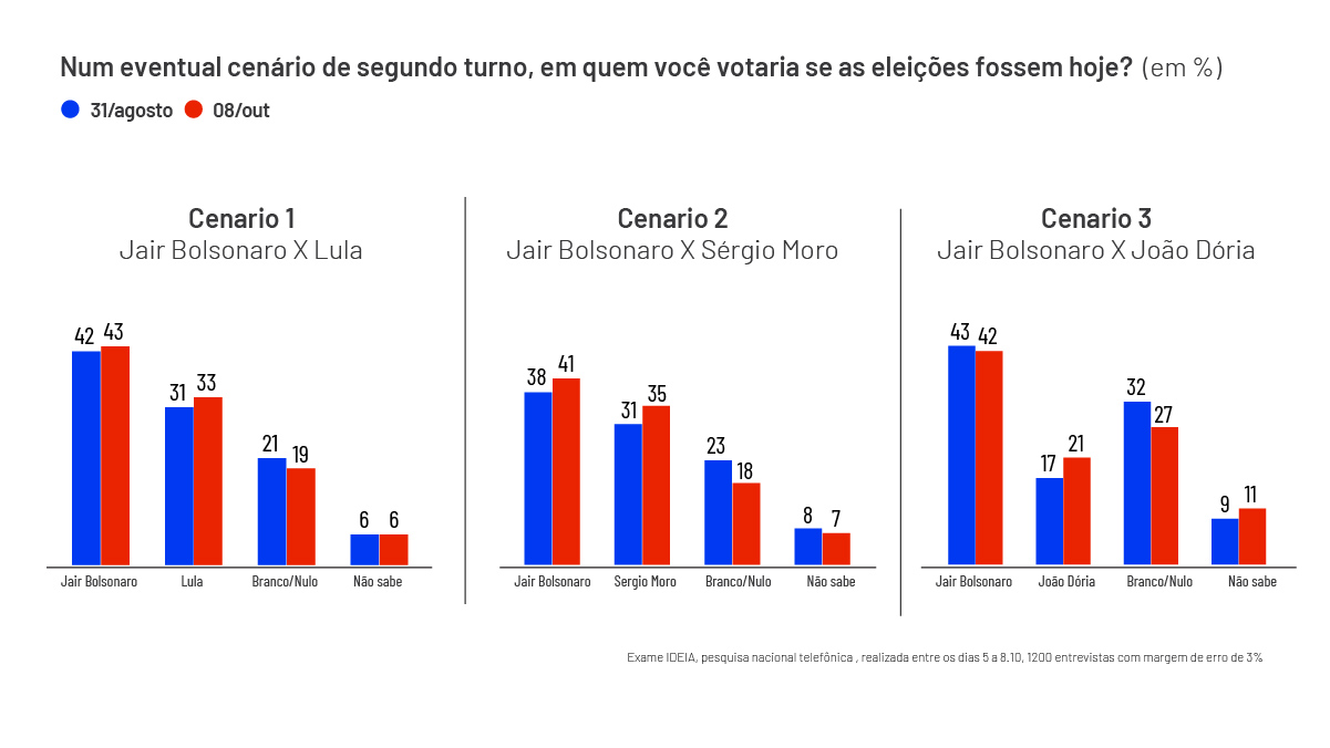 A pesquisa traz ainda alguns cenários de segundo turno, todos com a presença de Bolsonaro, contra Lula, Moro e Doria. Bolsonaro ganha de todos com larga vantagem.