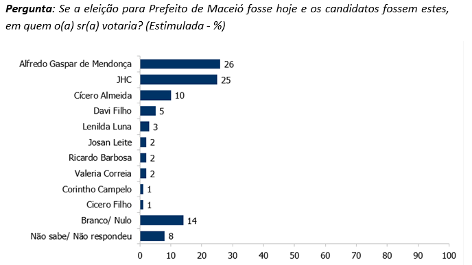 De acordo com o levantamento, os candidatos Alfredo Mendonça (MDB) e JHC (PSB) estão tecnicamente empatados com 26% e 25%, respectivamente. Em seguida, aparecem o ex-prefeito Cícero Almeida (DC) com 10%, Davi Filho (PP) com 5%.
