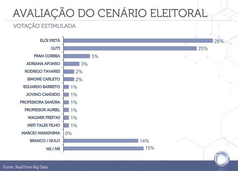 Pesquisa de intenção de voto realizada pelo RealTime Big Data e encomendada pela Record TV divulgada nesta quinta-feira (15) para as eleições para Prefeitura de Guarulhos aponta o candidato Elói Pietá (PT) com 28% das intenções de voto na pesquisa estimulada, seguido pelo prefeito Guti (PSD), com 25%.