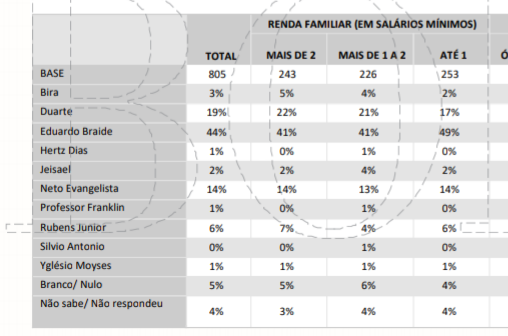 O candidato Eduardo Braide (Podemos) lidera nas três faixas de renda mensuradas pelo levantamento. Em seguida, Duarte (Republicanos) e Neto Evangelista (DEM) aparecem com um total de 19% e 14%, respectivamente.