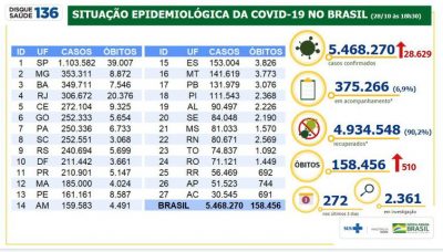São Paulo chegou a 1.103.582 de pessoas contaminadas. Os outros estados com maior número de casos no país são Minas Gerais (353.311) e Bahia (349.711). Já o Acre tem o menor número de casos (30.545), seguido de Amapá (51.523) e Roraima (56.469).